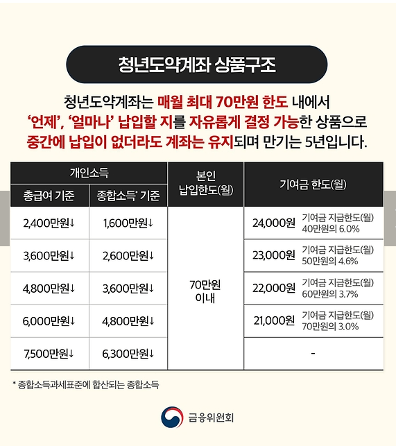 - 안내 및 문의 : 청년도약계좌 홈페이지와 서민금융진흥원 서민금융콜센터 (1397)를 이용 바랍니다.